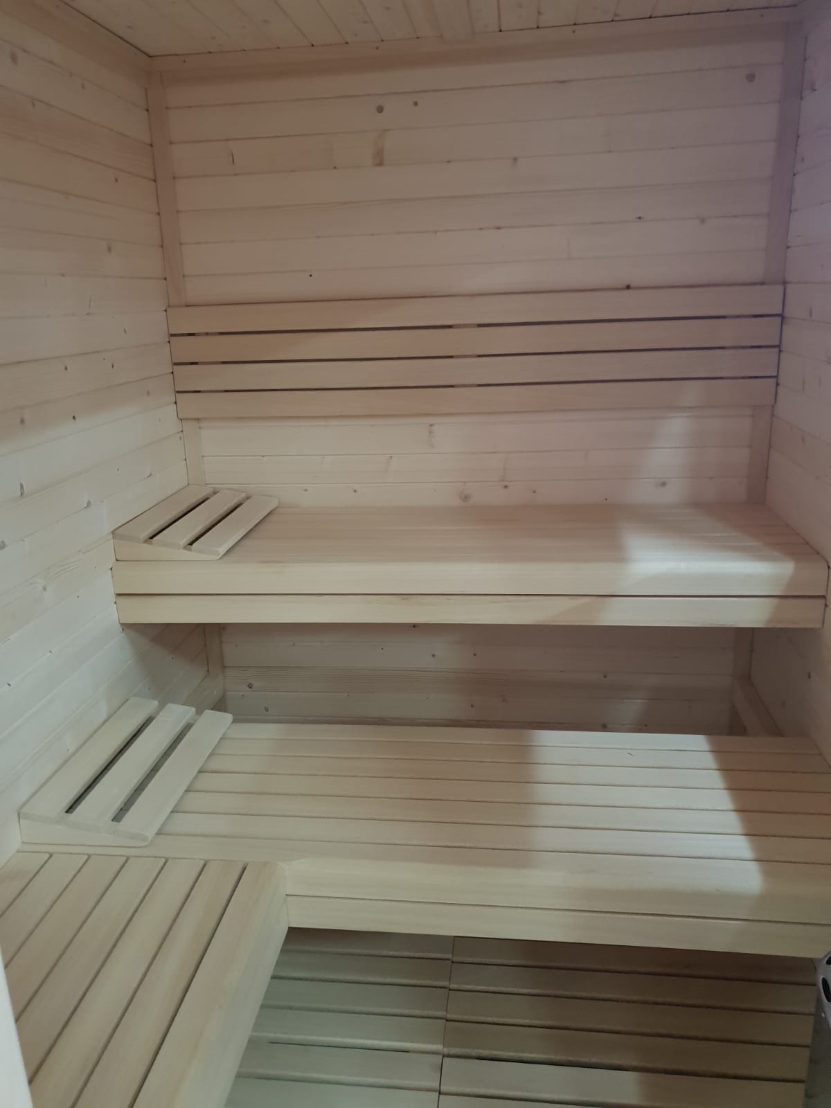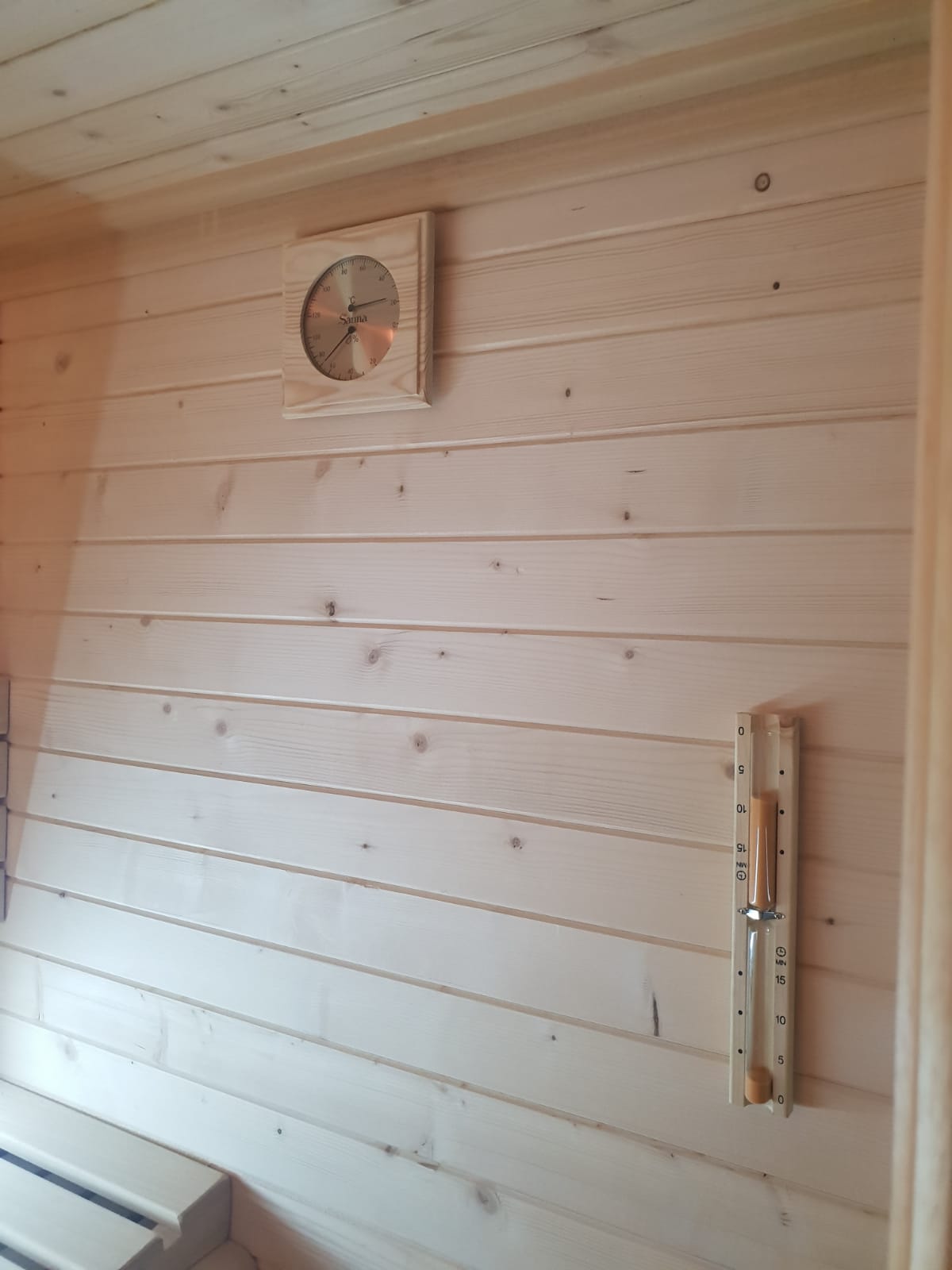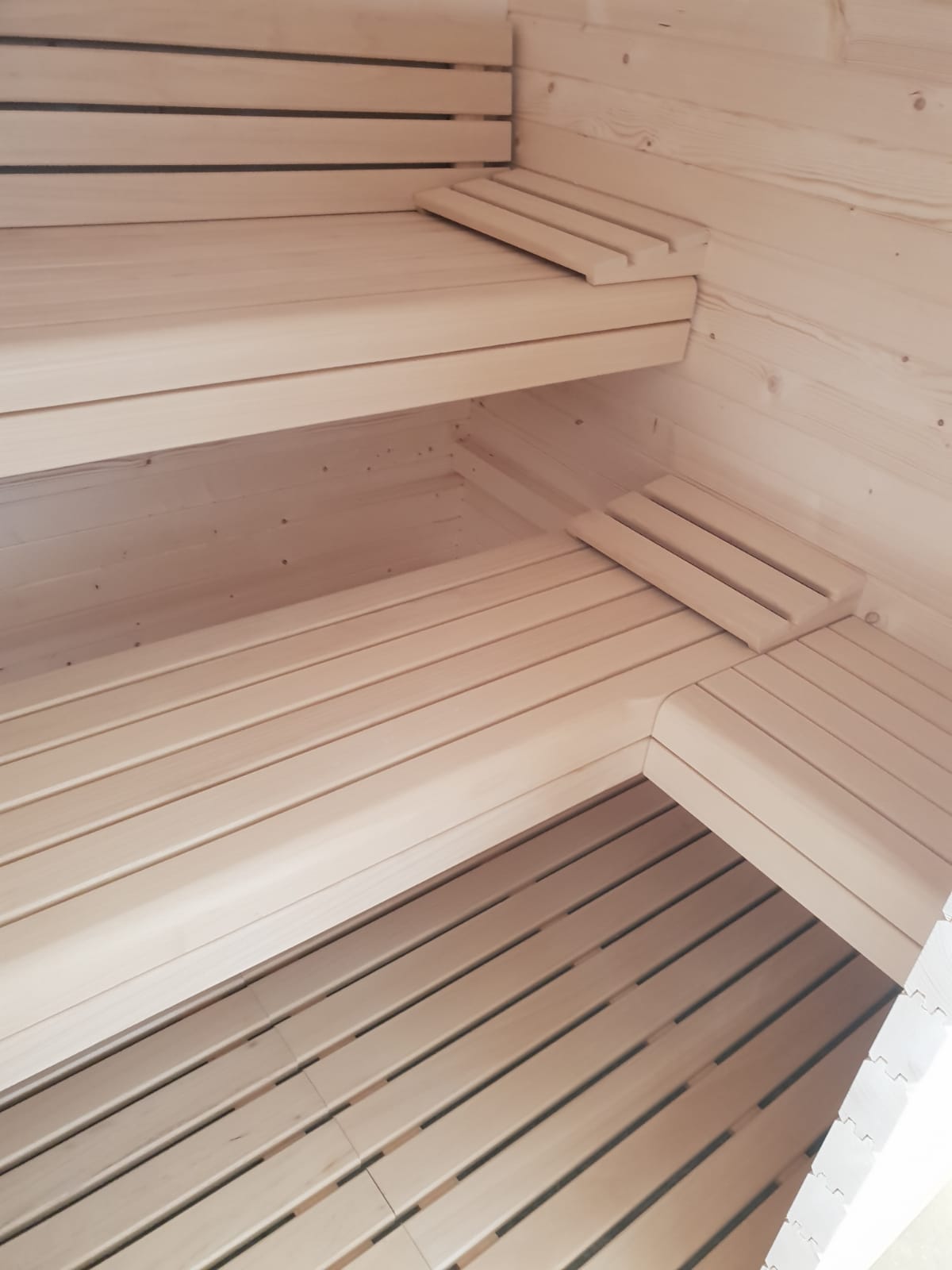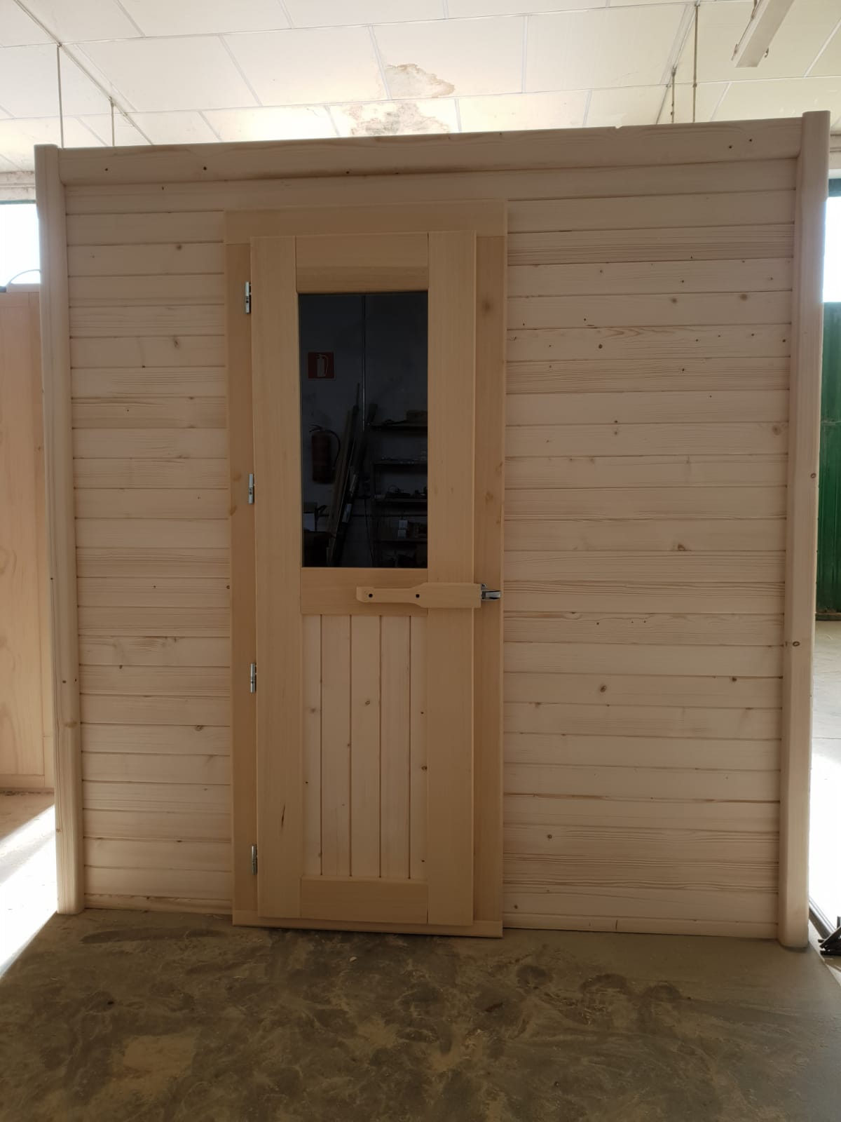 Sauna de madera maciza de abeto, bancos en Abachi, suelo enrejillado de Abachi, puerta con ventanuco de cristal, termometro-higrometro, cubo, cazo, calefactor eléctrico con mandos incorporados, reloj de arena